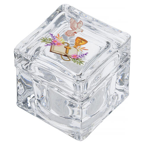 Remerciement pour la Première Communion en forme de cube en verre avec couvercle.