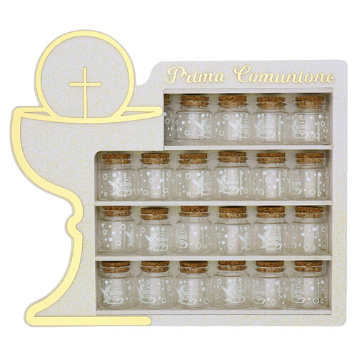 Set de souvenirs pour la Première Communion composé d'un présentoir et de 24 pots en verre avec bouchon en liège.