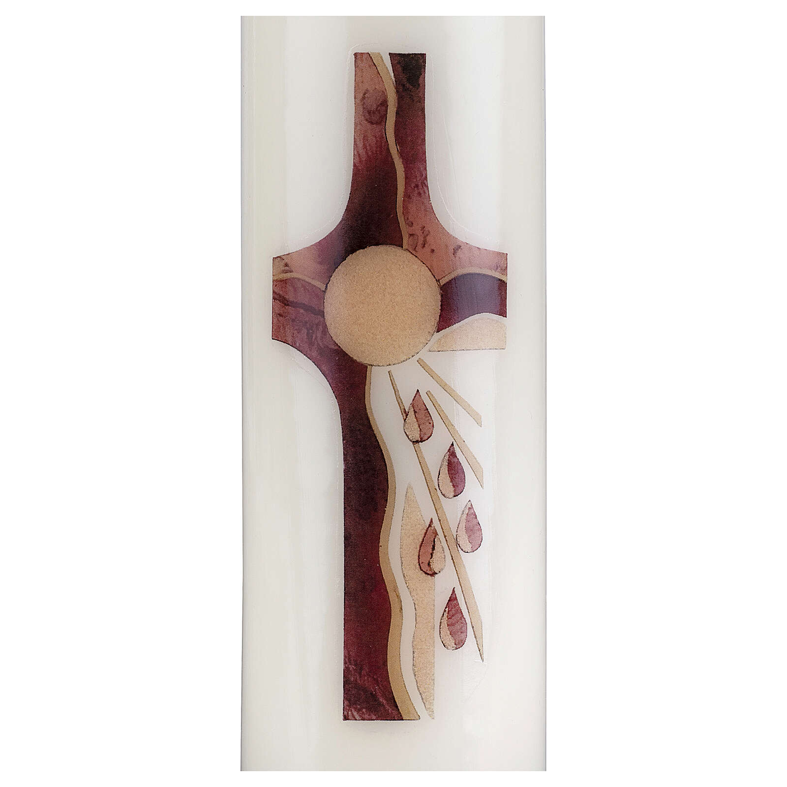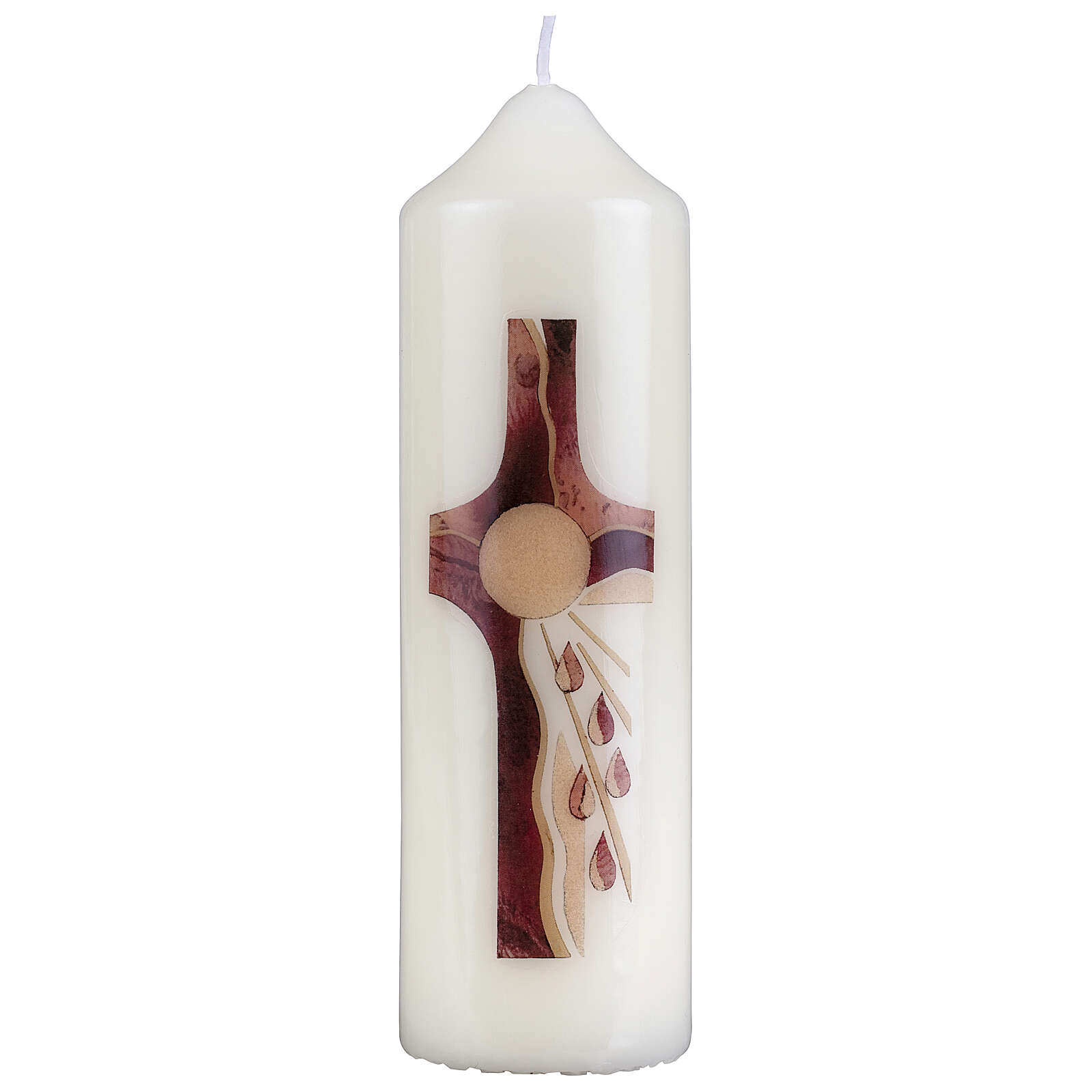 Bougie Cène blanche 16,5x5 cm. Bougie en cire blanche décorée avec les symboles de la Cène sur une croix rouge : un disque jaune, le pain, et des gouttes rouges, le sang de Christ.