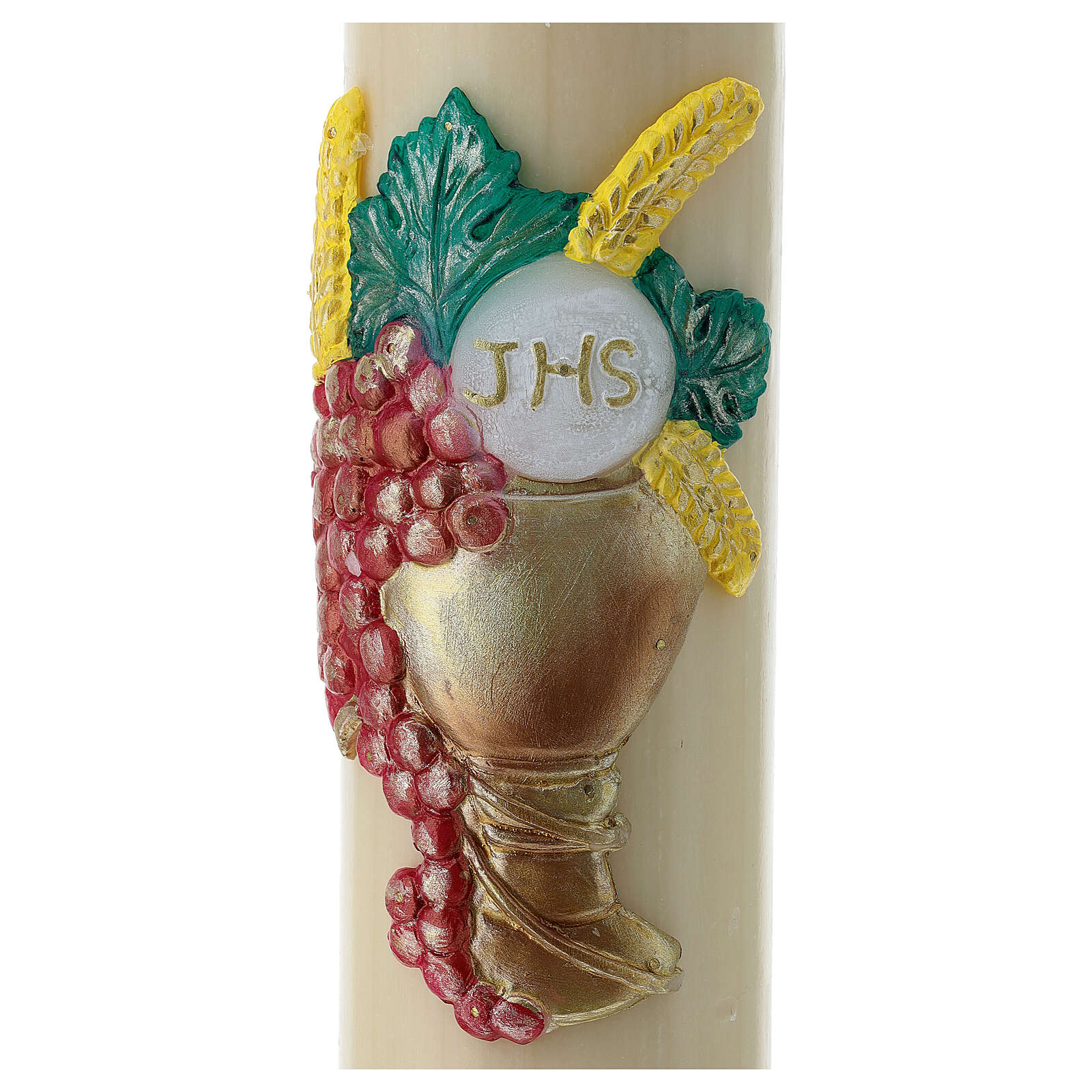 Bougie d'autel cire d'abeille calice raisin 300x80 mm. Bougie d'autel en cire d'abeille avec décoration colorée en forme de calice avec grappe de raisin, épis et hostie IHS.