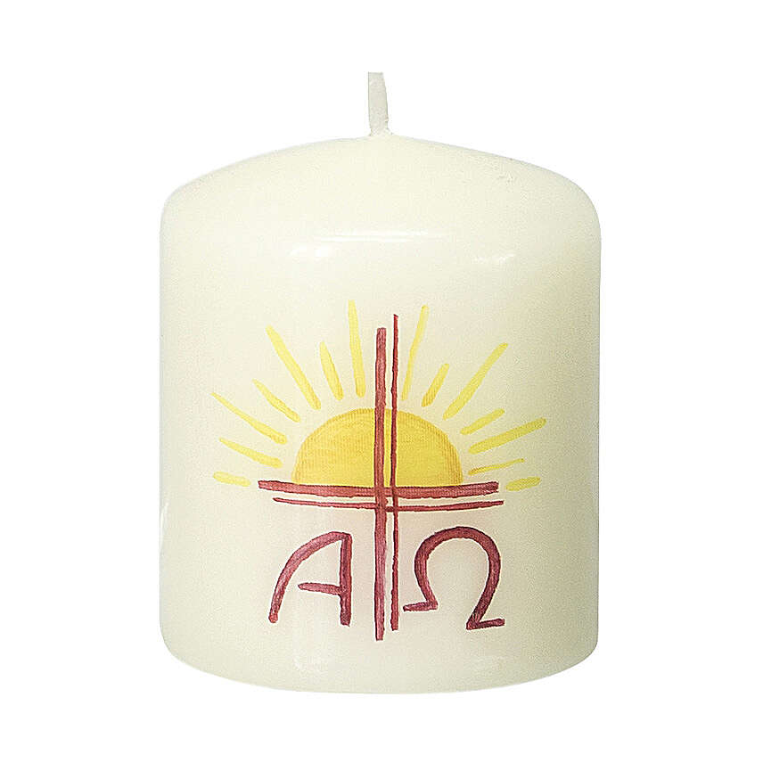 Cierge croix soleil Alpha et Oméga 6x5 cm. Cierge en cire couleur ivoire, décoré d'une croix rouge stylisée avec soleil et lettre Alpha et Oméga en rouge.