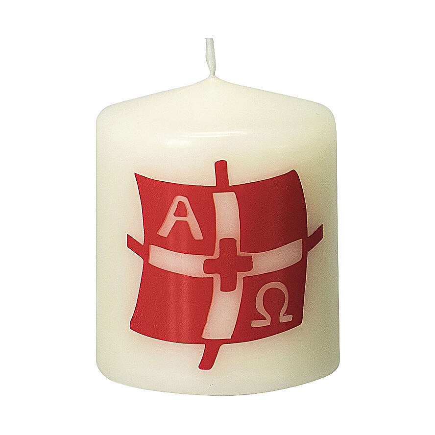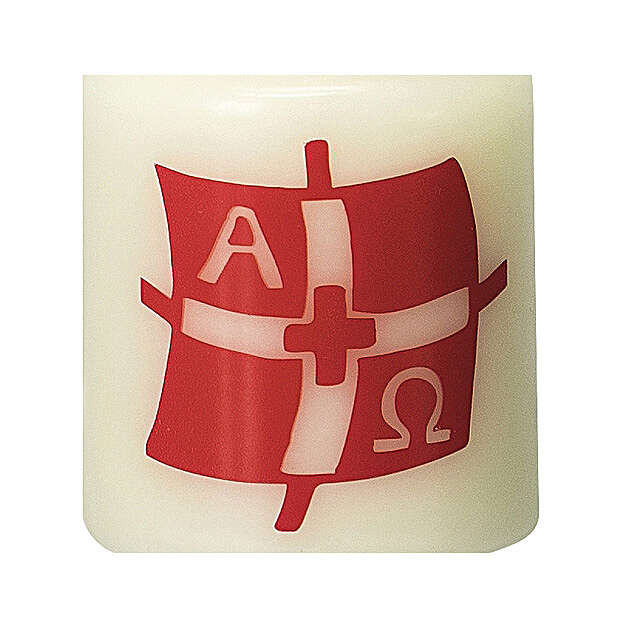 Cierge drapeau Résurrection 6x5 cm. Cierge en cire ivoire, décoré d'une croix blanche sur fond rouge rappelant le drapeau de l'Agneau de Dieu.