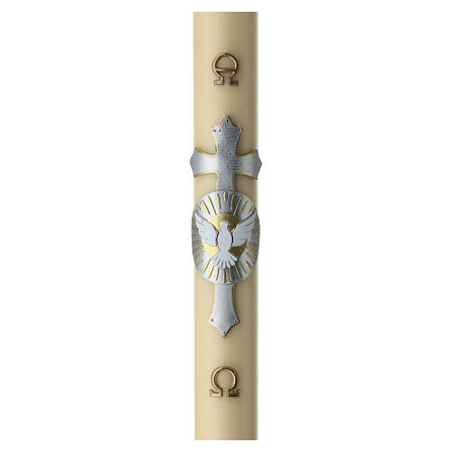 Cierge liturgique en cire d'abeille de couleur ivoire naturel, décoré d'une croix argentée et d'une colombe du Saint-Esprit en relief sur un fond rayonnant argenté.