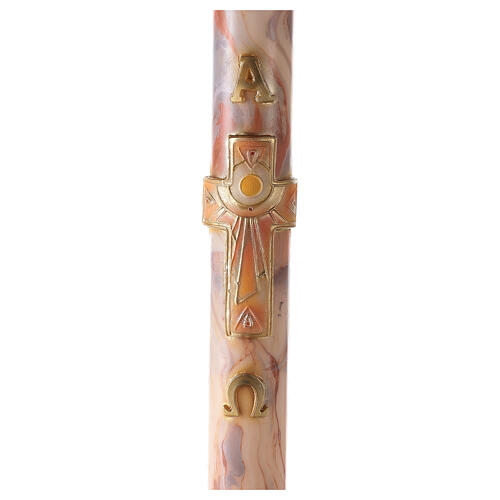 Cierge pascal Alpha Oméga croix latine avec soleil sur fond marbré blanc-orange 120x8 cm