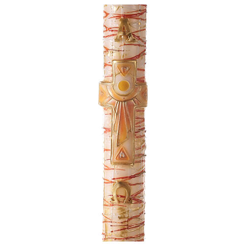 Cierge pascal blanc Alpha Oméga croix motif gouttes 120x8 cm. Cierge pascal en paraffine blanche, décoré à la main en relief avec un motif horizontal de gouttes rouges rappelant du sang et une croix latine avec un soleil stylisé à son intérieur, accompagnée des lettres Alpha et Oméga.