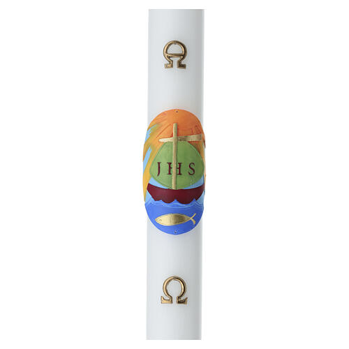 Cierge en cire blanche à finition mate, avec décor central représentant des symboles chrétiens : la croix, le monogramme IHS, un poisson, un bateau et des lignes ondulées sur un fond coloré.