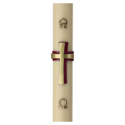 Cierge pascal en pure cire d'abeille, de ton ivoire naturel, avec décor central représentant une croix dorée bordée de rouge en bas-relief.