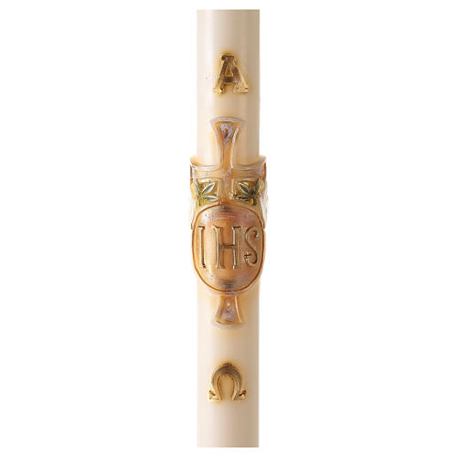 Cierge pascal couleur ivoire JHS sur croix en relief 120x8 cm. Cierge pascal en paraffine couleur ivoire, produit et décoré en Italie par des artistes expérimentés avec une décoration en relief représentant le monogramme JHS au centre d'une croix entourée de feuilles.