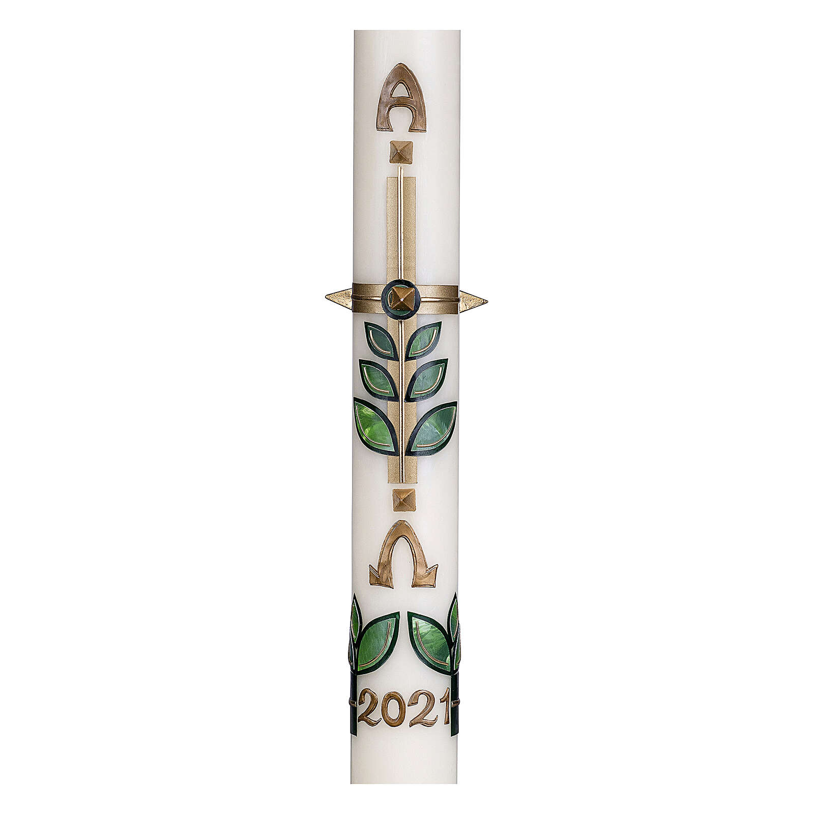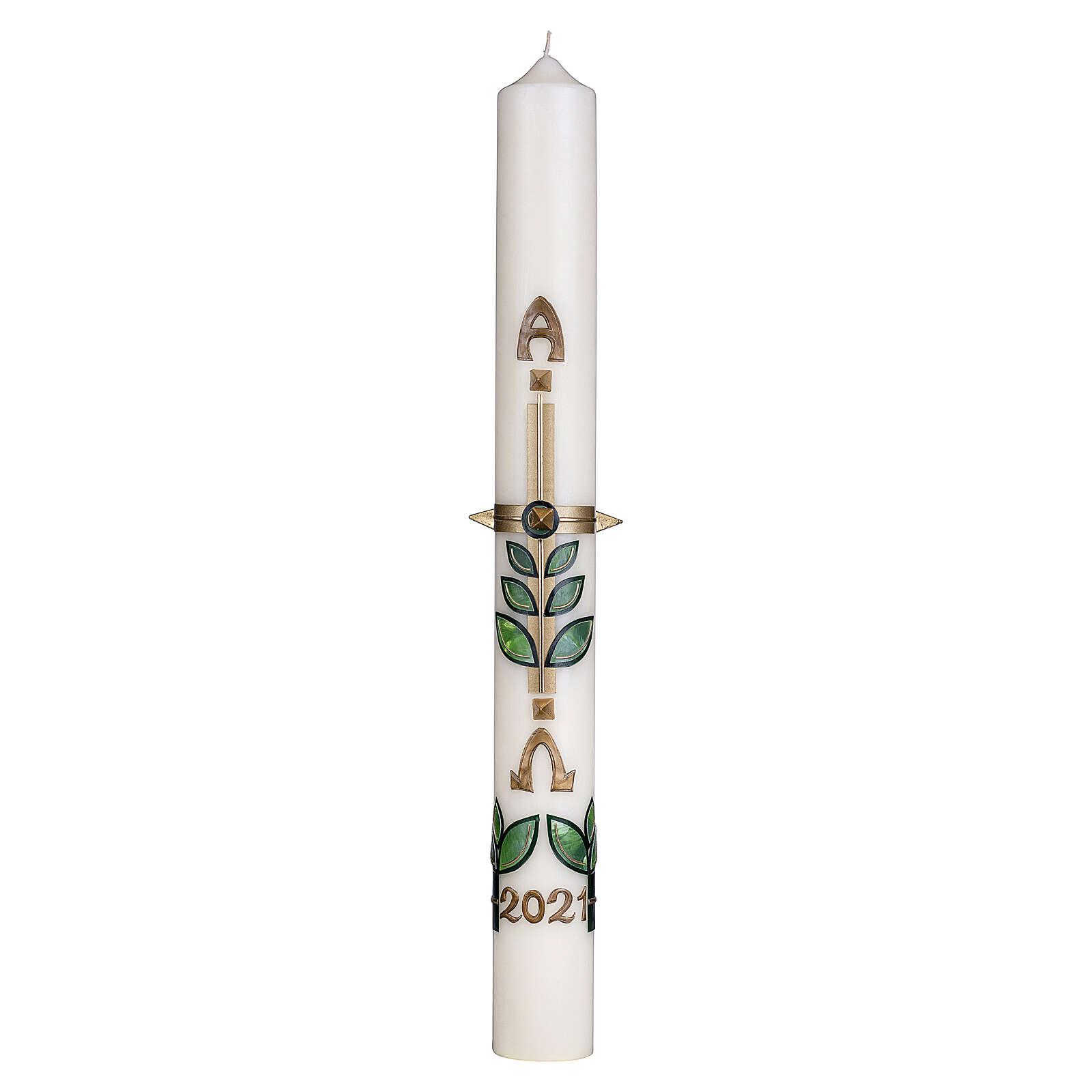 Cierge de 80 cm de hauteur et 8 cm de diamètre avec une décoration de feuilles et de branches qui enveloppent la croix dorée. À en souligner la forme, cinq clous en relief complètent la croix.