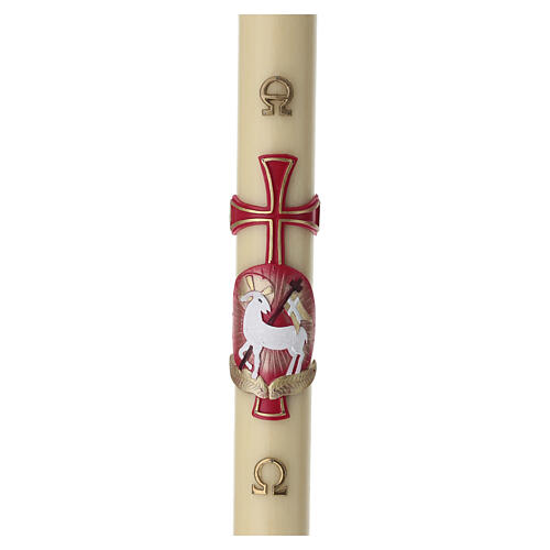 Cierge pascal en cire d'abeille couleur ivoire avec décor central en relief représentant l'Agneau pascal sur fond rouge intense, accompagné d'une croix verticale.