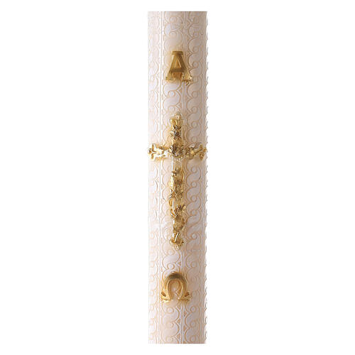 Cierge pascal motif dentelle croix trilobée fleurie Alpha et Oméga 120x8 cm. Cierge pascal avec motif de dentelle et décoration en relief représentant une croix trilobée fleurie et les lettres Alpha et Oméga en doré.