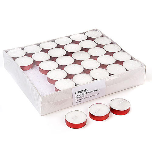 Lampe votive Tealight quasar classique. Bougie avec support en aluminium rouge qui permet de bruler complètement la cire sans s'éteindre. Durée de la combustion, 1 heure. Chaque boite contient 90 lampes.