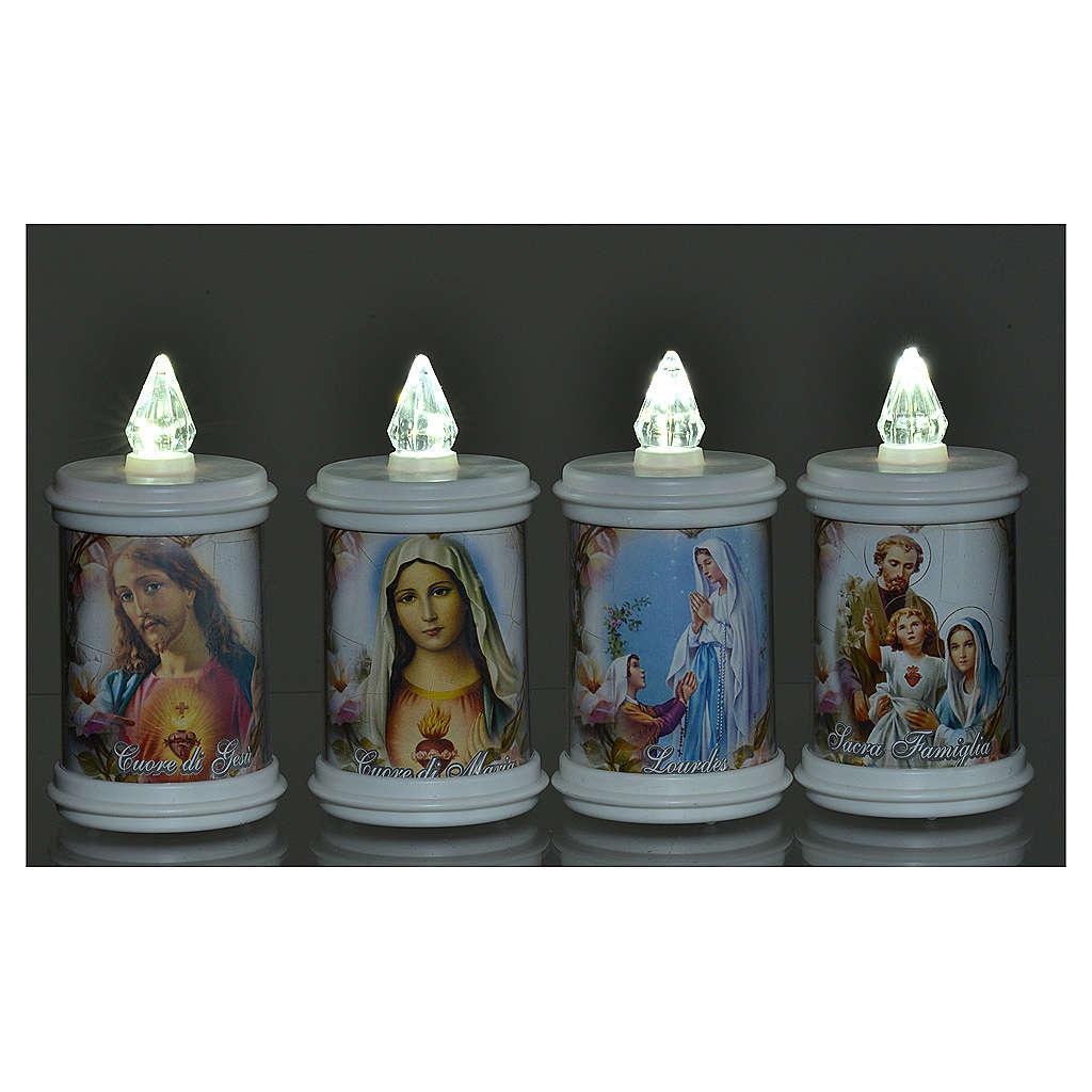 Bougie veilleuse blanche LED. Veilleuse blanche électrique en abs d'une durée de 90 jours. Plusieurs images sont disponibles et toutes ont une prière en italien sur le derrière.