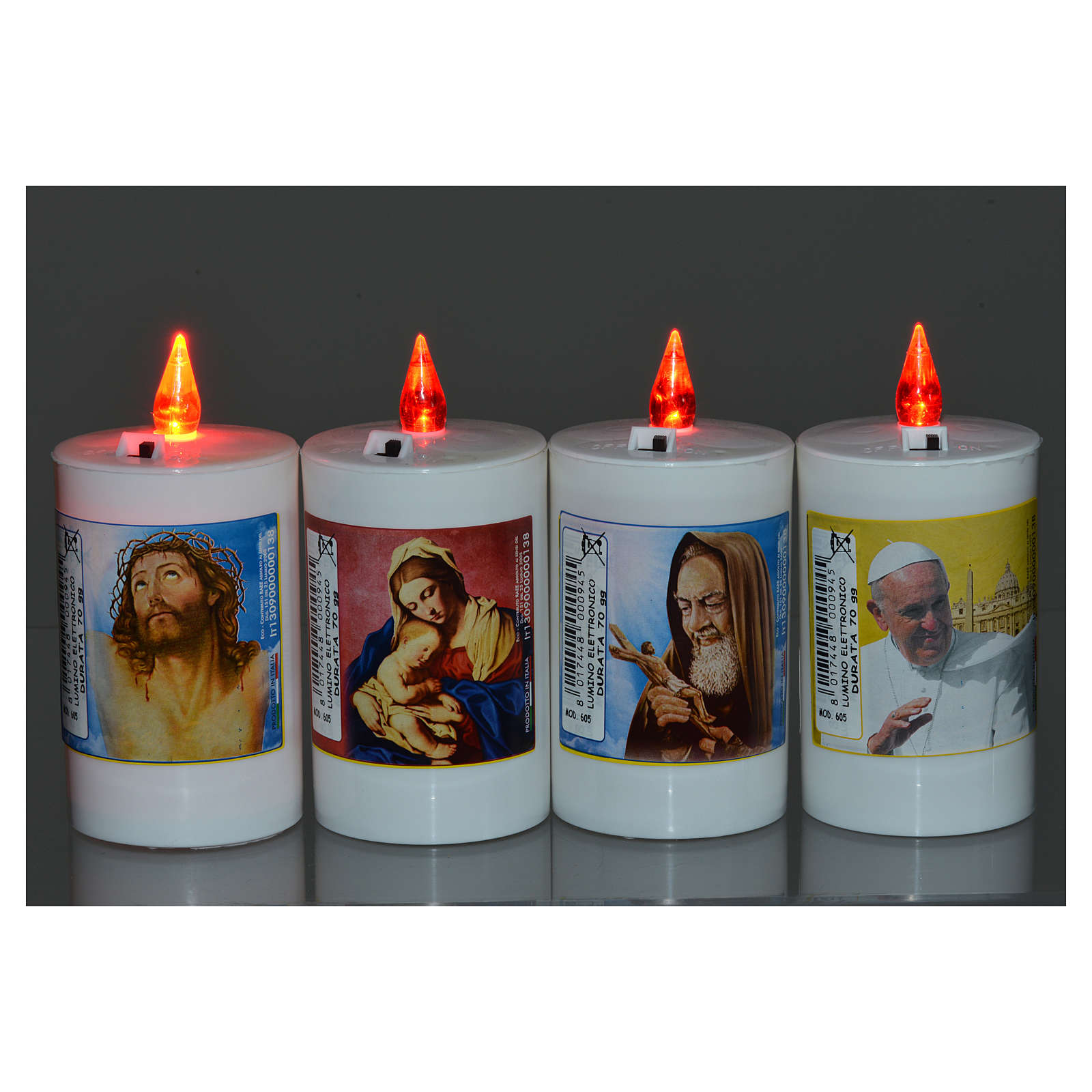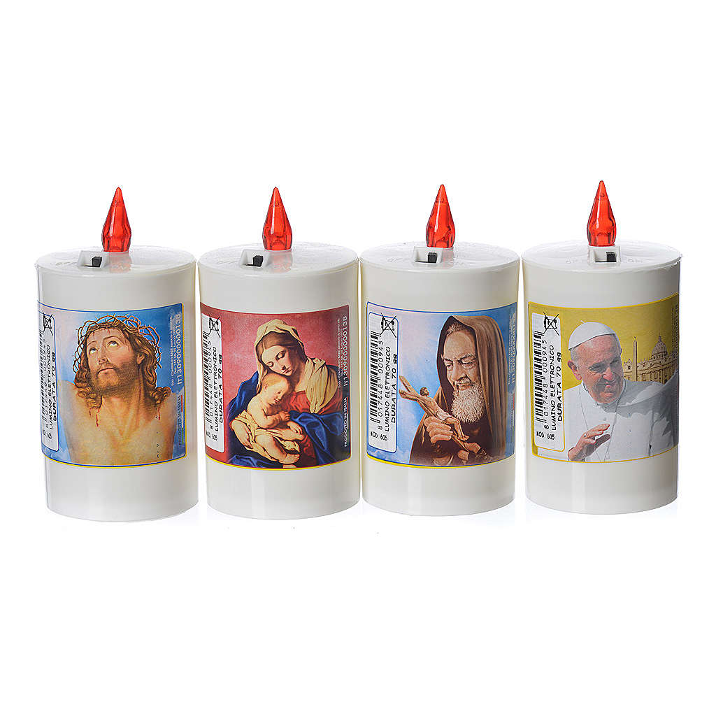 Bougie veilleuse blanche LED. Veilleuse blanche électrique en plastique d'une durée de 60 jours. Plusieurs images sont disponibles et toutes ont une prière en italien sur le derrière. Veilleuse jetable