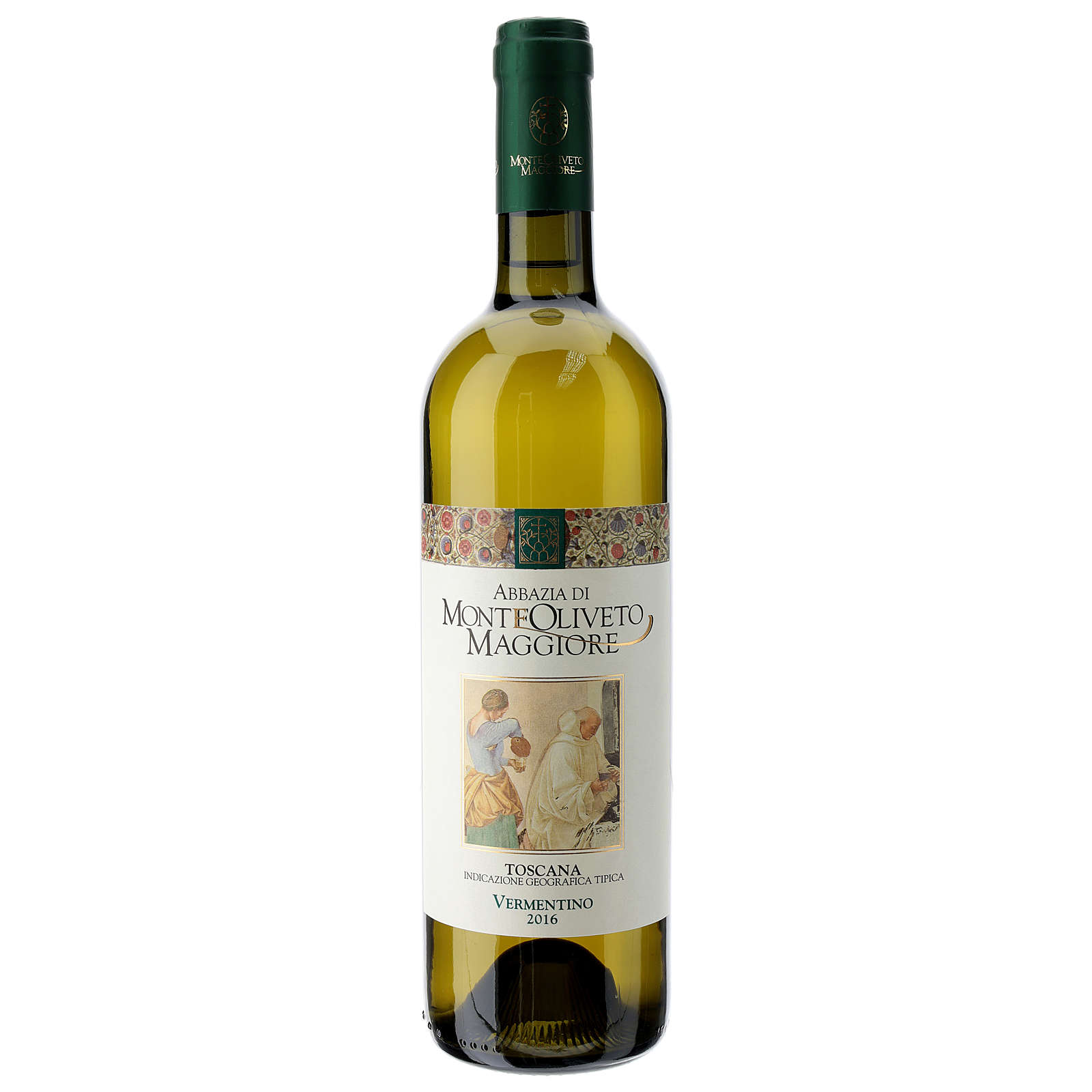 Vin blanc de Toscane IGT Abbaye Monte Oliveto 750 ml. Vin produit avec raisins des vignobles de l'Abbaye de Monte Oliveto , Asciano, zone de Siena. Les moines de ces terres ont soigneusement fait pousser les oliviers et les vignes de Vermentino et Chardonnay.